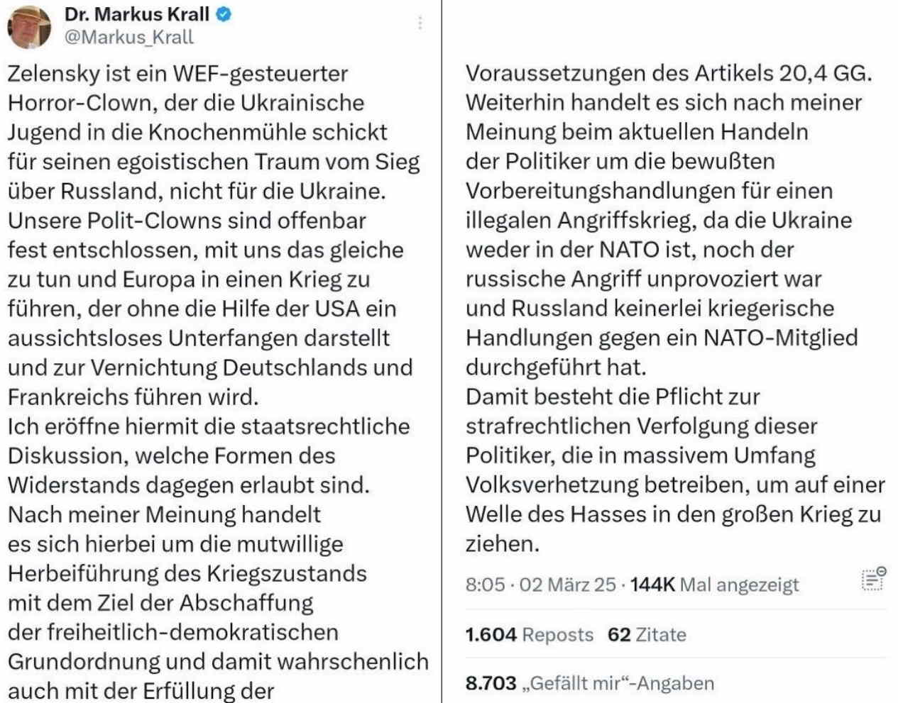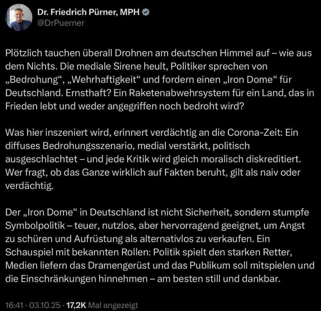 In Deutschland herrscht eine Meinungsdiktatur, wie es sie nur in totalitären Systemen gibt, egal ob MassenMigration, Covid Gen-Spritzen, das Ukraine-Debakel, was auch immer – eine nüchterne, konstruktive Evaluation findet nicht statt, schon der banale Hinweis auf «audiatur et altera pars», auf den fundamentalen Grundsatz, dass bei jeder angemessenen Beurteilung immer beide Seiten zu berücksichtigen sind scheint verboten, stattdessen stürzt man sich sogleich mit demselben Fanatismus ins nächste Unheil. Sachliche Analysen sind nicht erlaubt. Herstellung von Kontext, aufzeigen von Zusammenhängen, sind verboten. Es wird ein neues Dogma vorgegeben und alle müssen es nachbeten, wer nicht auf Linie ist wird gecancelt, ausgegrenzt, dämonisiert, diffamiert und nicht selten mit brutalen Hausdurchsuchungen schikaniert. CDU-Politiker ruft jetzt dazu auf, den «Spannungsfall» zu aktivieren. Der «Spannungsfall» ist ein Begriff aus dem deutschen Verfassungsrecht und bezeichnet eine besondere sicherheitspolitische Lage zwischen Friedenszeit und dem Verteidigungsfall.