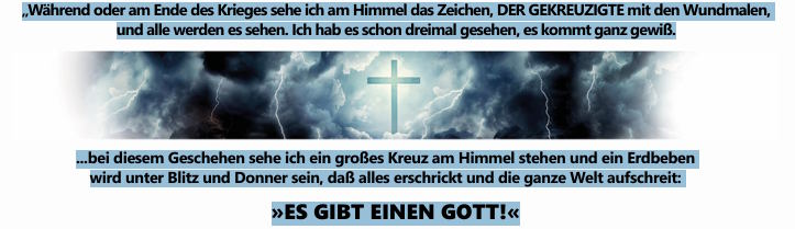 vgl. Botschaft Eisenberg «Die große Übermacht des Weltkommunismus wird unerwartet über die noch freien Länder hereinbrechen, denn er kennt keine Grenzen. Das wird die große Weltkatastrophe auslösen! Ich spreche die gleiche Sprache wie in Fatima. Das Gericht könnte höchstens noch abgewendet oder gemildert werden, wenn sich die Bischöfe und Priester an die Spitze eines Gebetssturmes stellen würden»