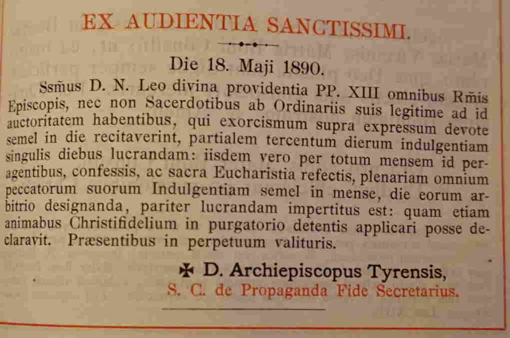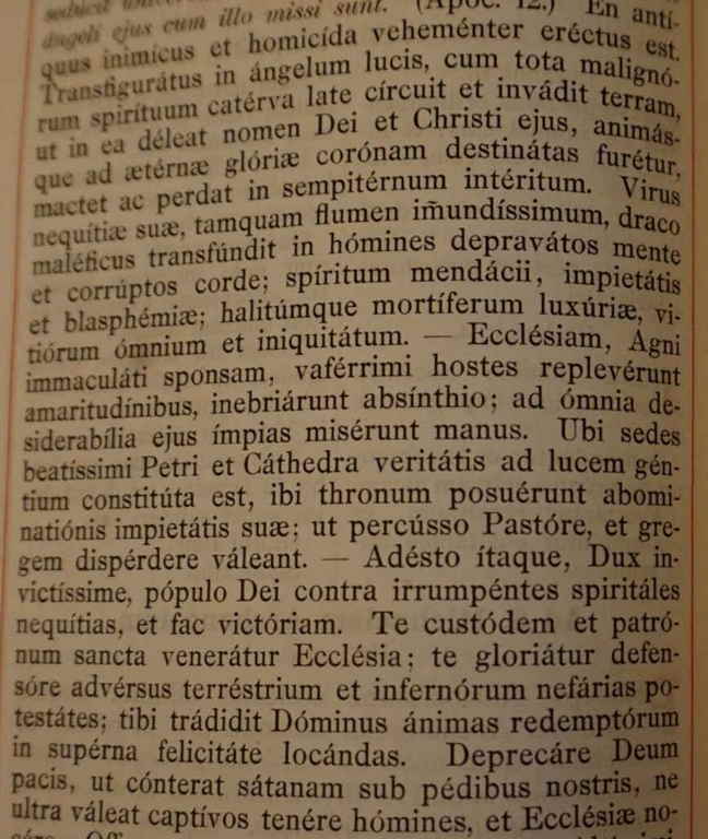 Um Hilfe und Fürsprache wollen wir uns an die Jungfrau und Gottesmutter Maria wenden, daß sie, die schon in ihrer Empfängnis den Satan besiegte, auch im Kampfe gegen die gottlosen Geheimbünde ihre Macht zeige, da in ihnen offenbar die satanischen Geister der Empörung mit ihrer alten Treulosigkeit und Heuchelei neu aufleben. Wir wollen auch den Fürsten der seligen Geister, den Sieger über die feindlichen Mächte der Hölle, den hl. Michael beschwören ; desgleichen den heiligen Joseph, den Bräutigam der seligsten Jungfrau, und mächtigen Patron der katholischen Kirche im Himmel, die großen Apostel Petrus und Paulus, die den christlichen Glauben ausgesät und siegreich beschützt haben. Auf den Schutz dieser Heiligen und auf die beharrlichen, gemeinschaftlichen Gebete vertrauend, hoffen Wir, daß Gott der von so vielen Gefahren umringten Menschheit zur rechten Zeit gnädig zu Hilfe kommen werde.